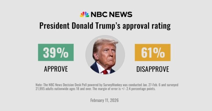 It has all put Trump in a perilous spot politically as midterm elections approach during his second year in office. Trump’s overall job approval slid to the lowest mark in NBC News Decision Desk polling of his second term, slightly down from 42% in December’s survey to 39% now.